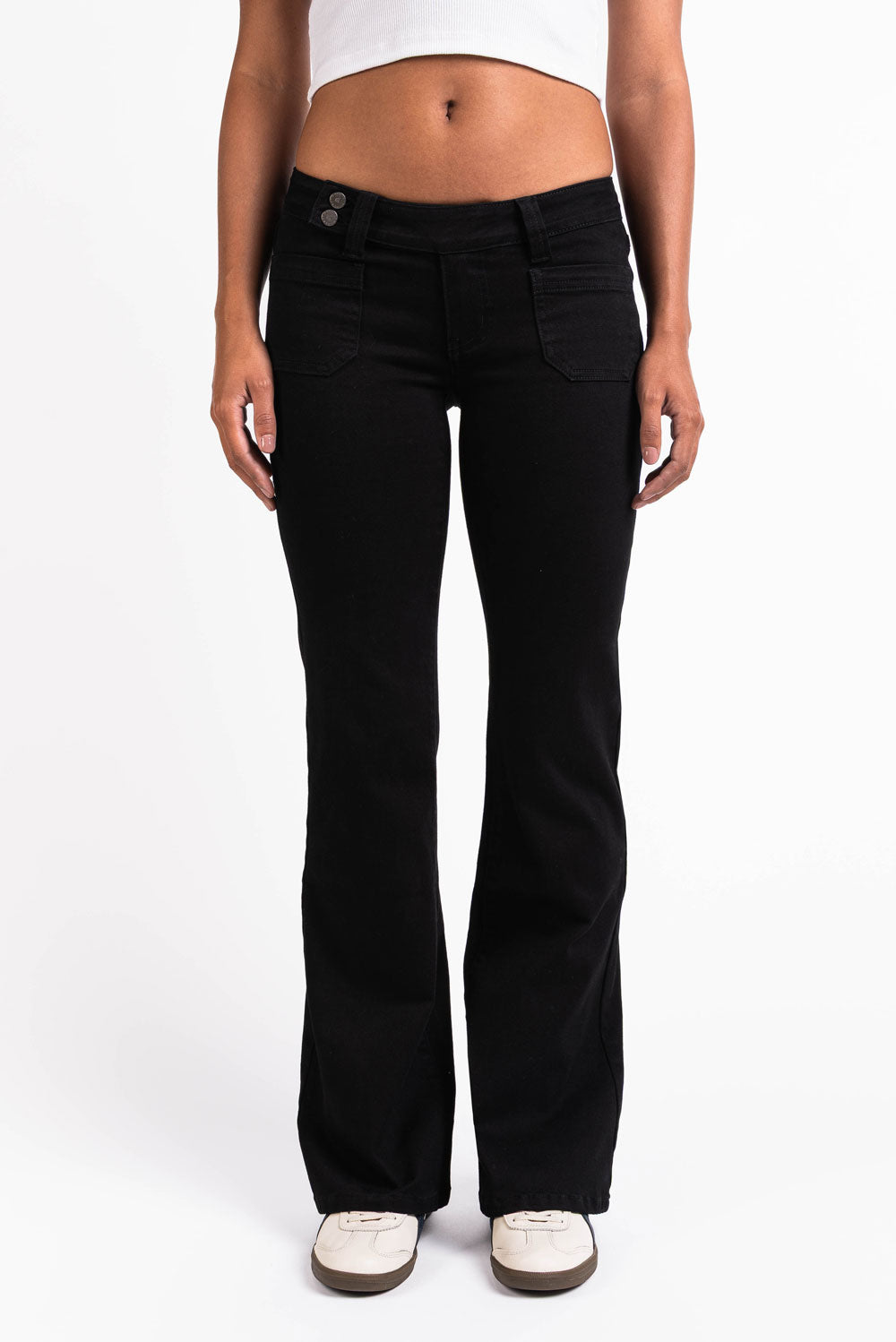 Diese Jeans mit ultra niedriger Taille haben eine Bootcut-Passform mit Rücken- und Vordertaschen für den praktischen Alltag. Großzügige Gürtelschlaufen, die sowohl für schmale als auch breite Gürtel geeignet sind. Die Hose wird mit einem Reißverschluss und dekorativ versetzten Knöpfen für ein stilvolles Detail geschlossen.