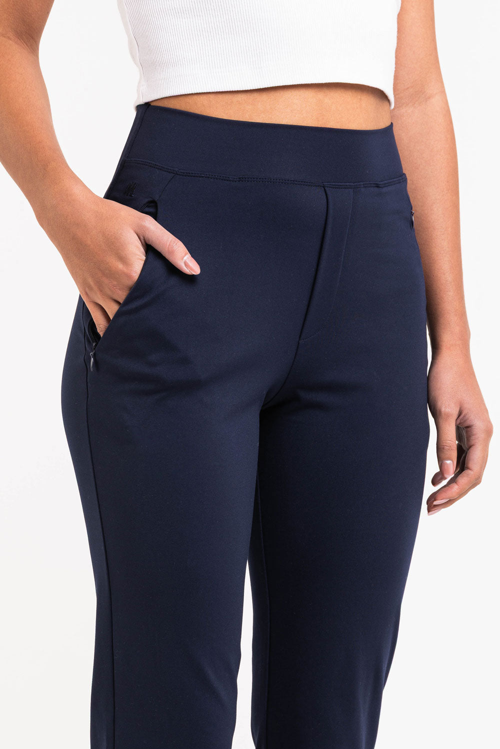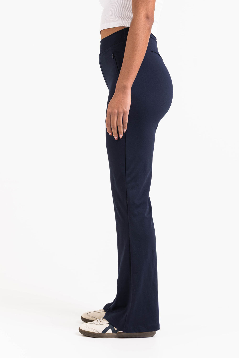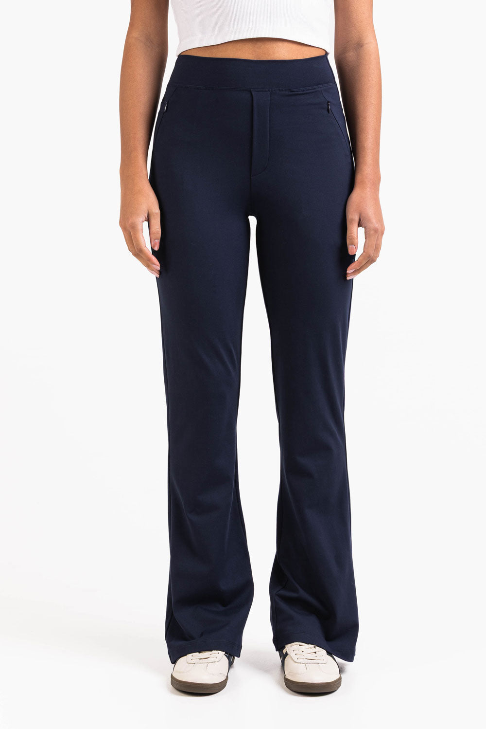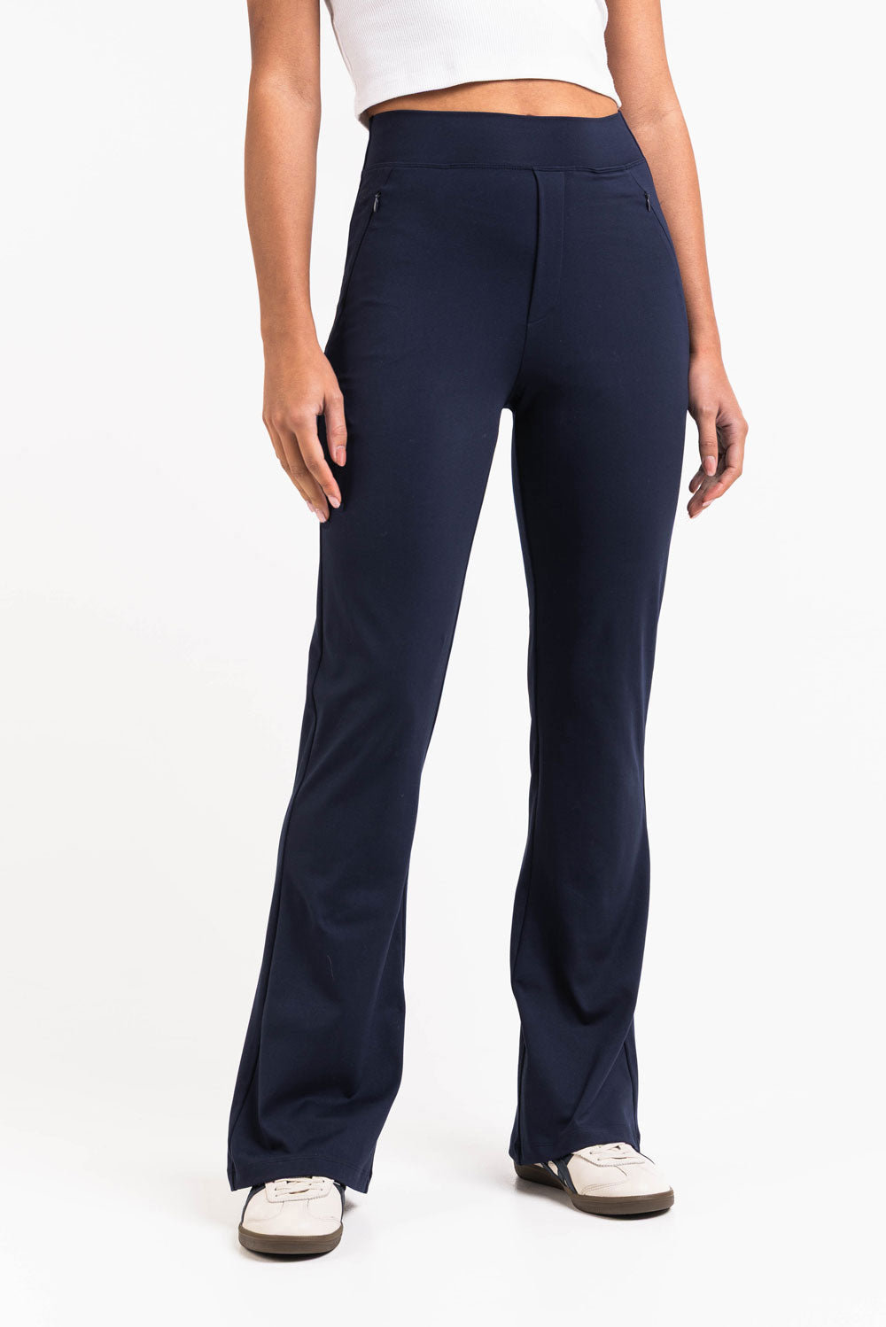 Hybrid pants with the best of two worlds - they're sporty and comfy with a dressy look. The pants have two side pockets with zippers. The waist is stretchy, and the legs are flared.