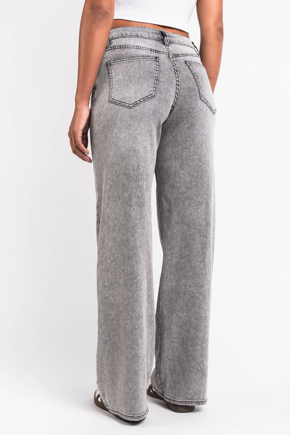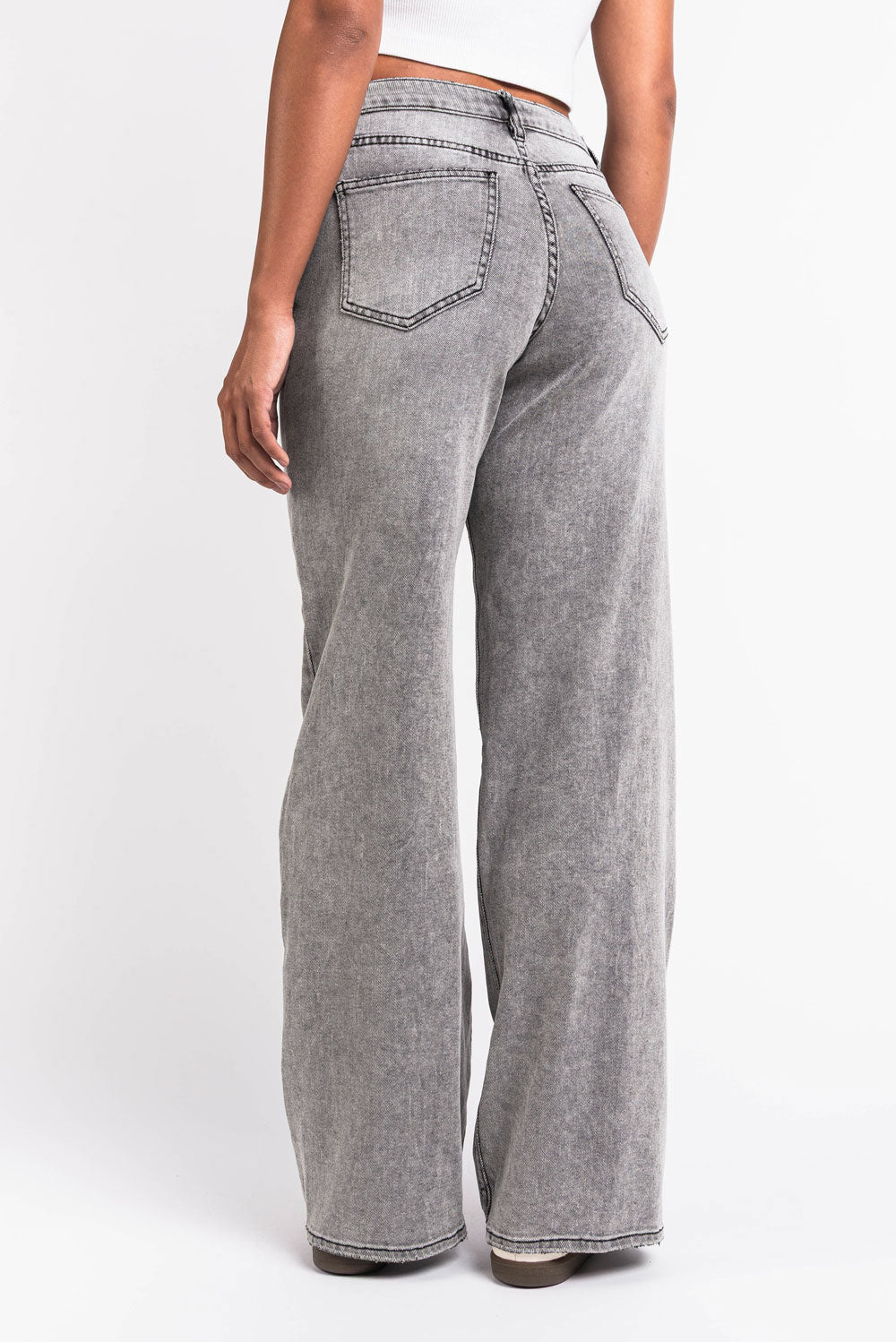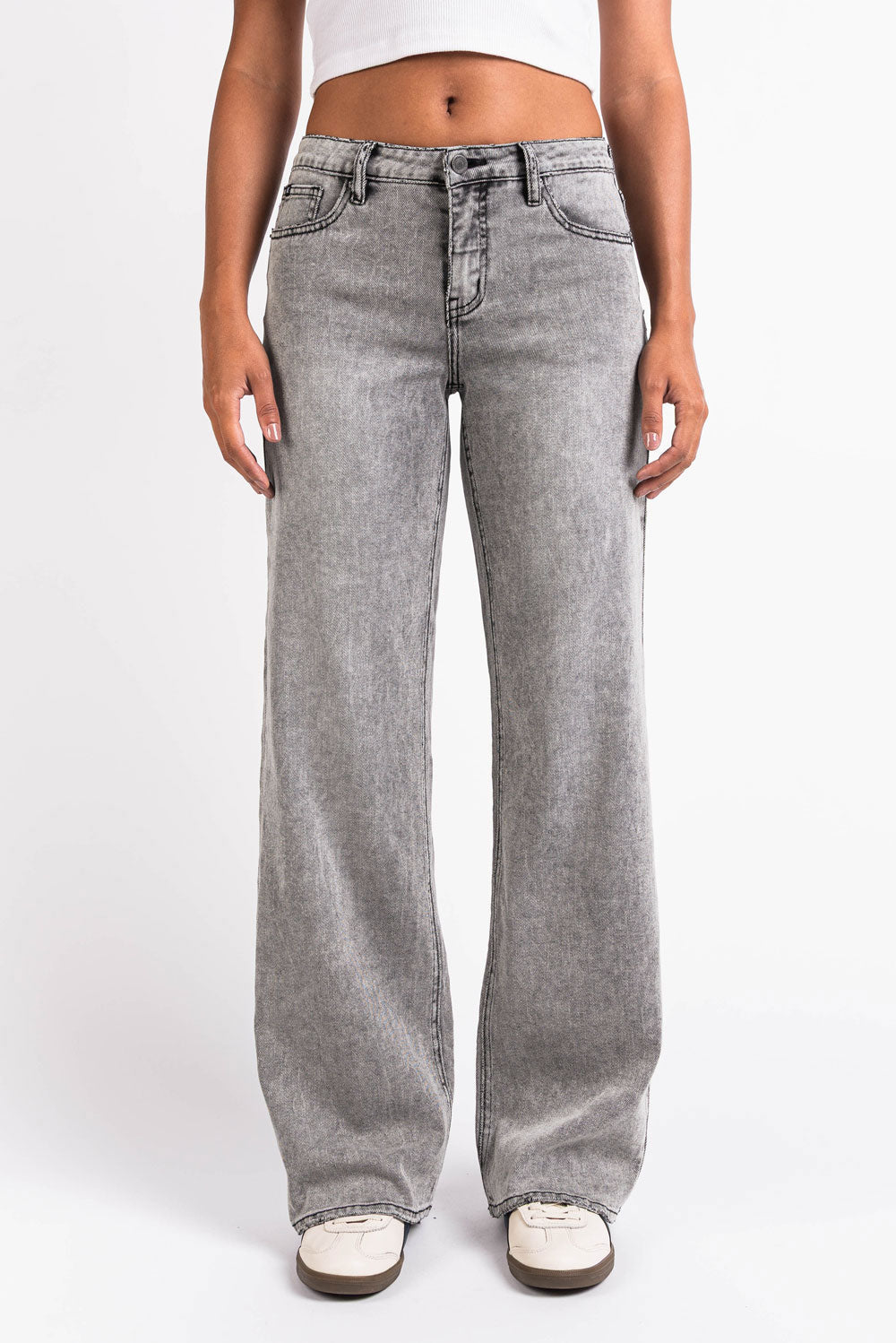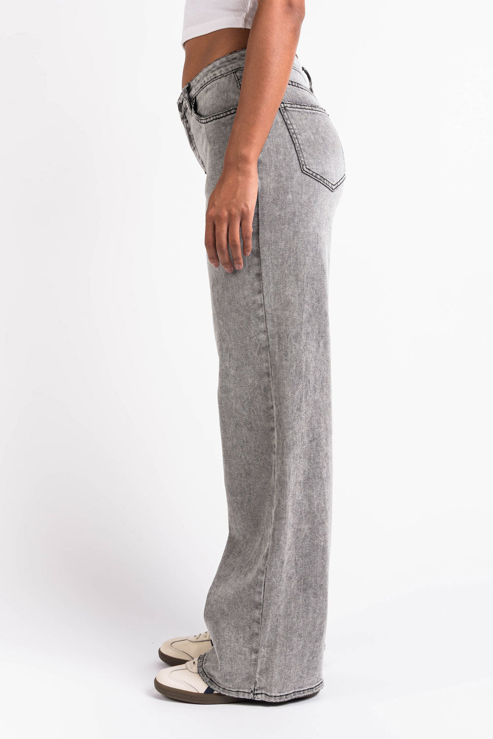 Mid waisted jeans with wide legs and pockets in the front and back. Belt loops that fit both thinner as well as a thicker belt. The pants close with a zipper and button.