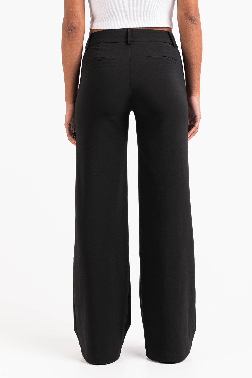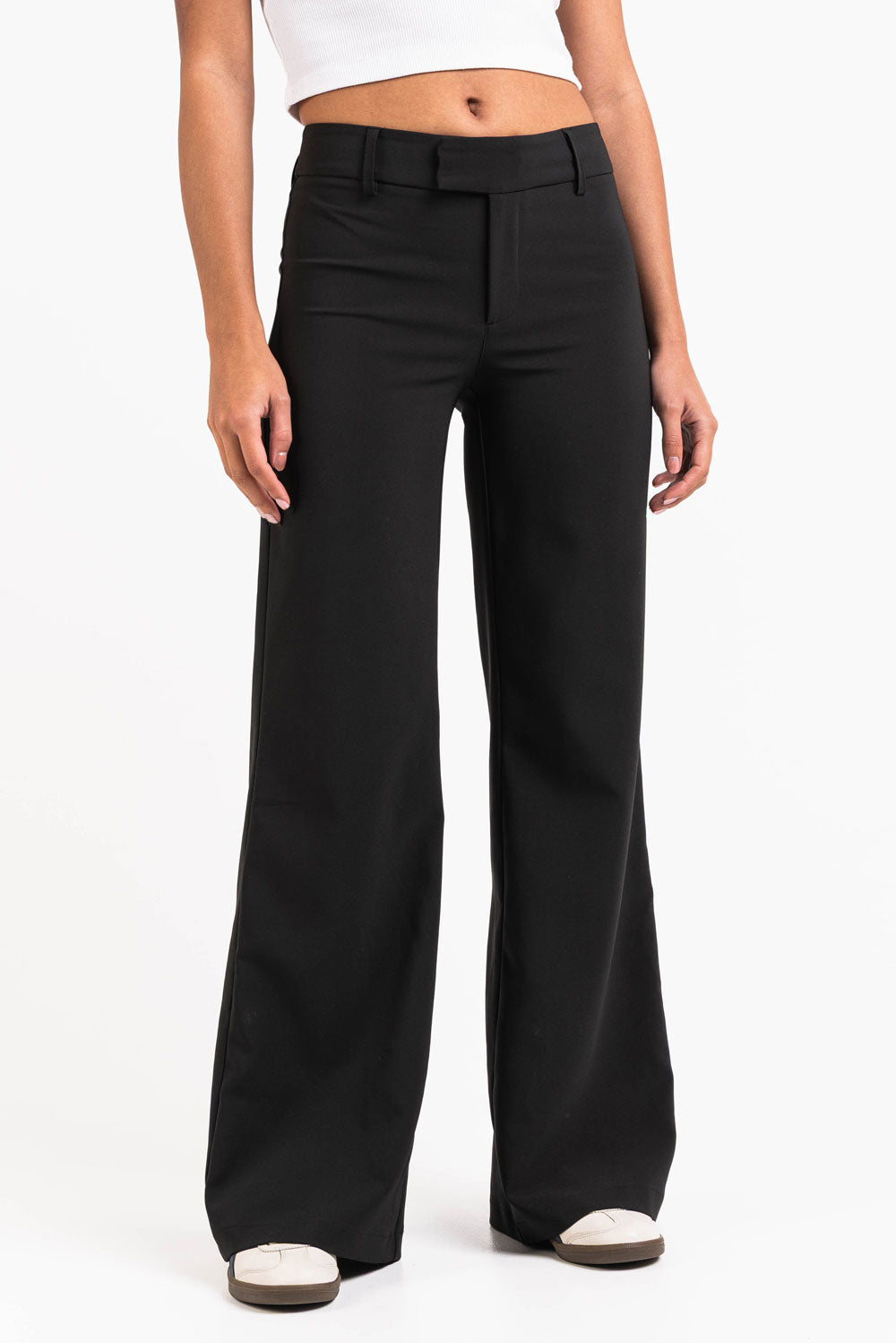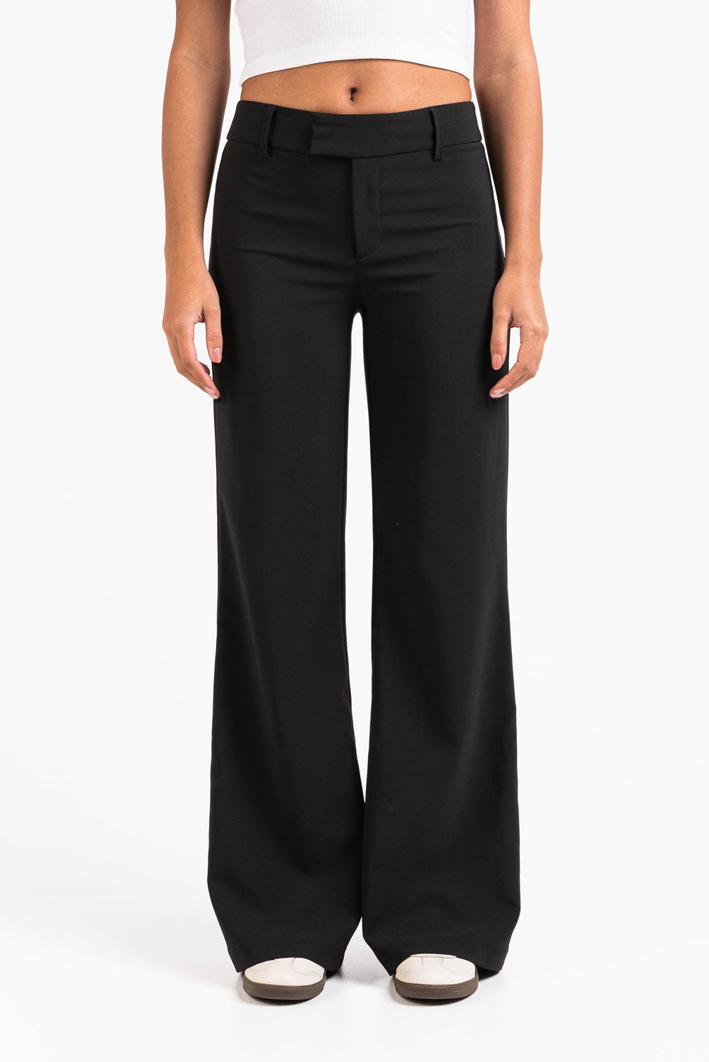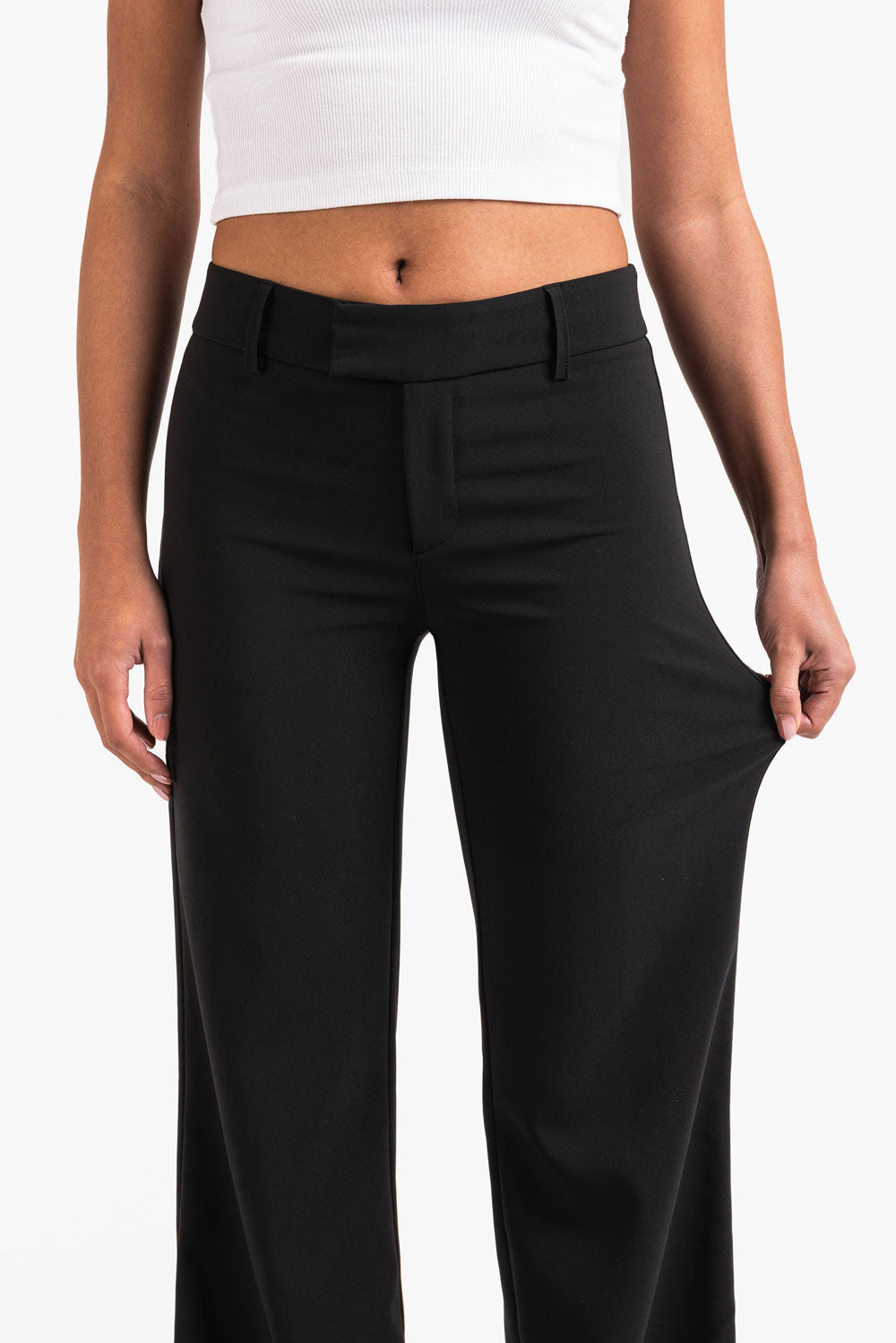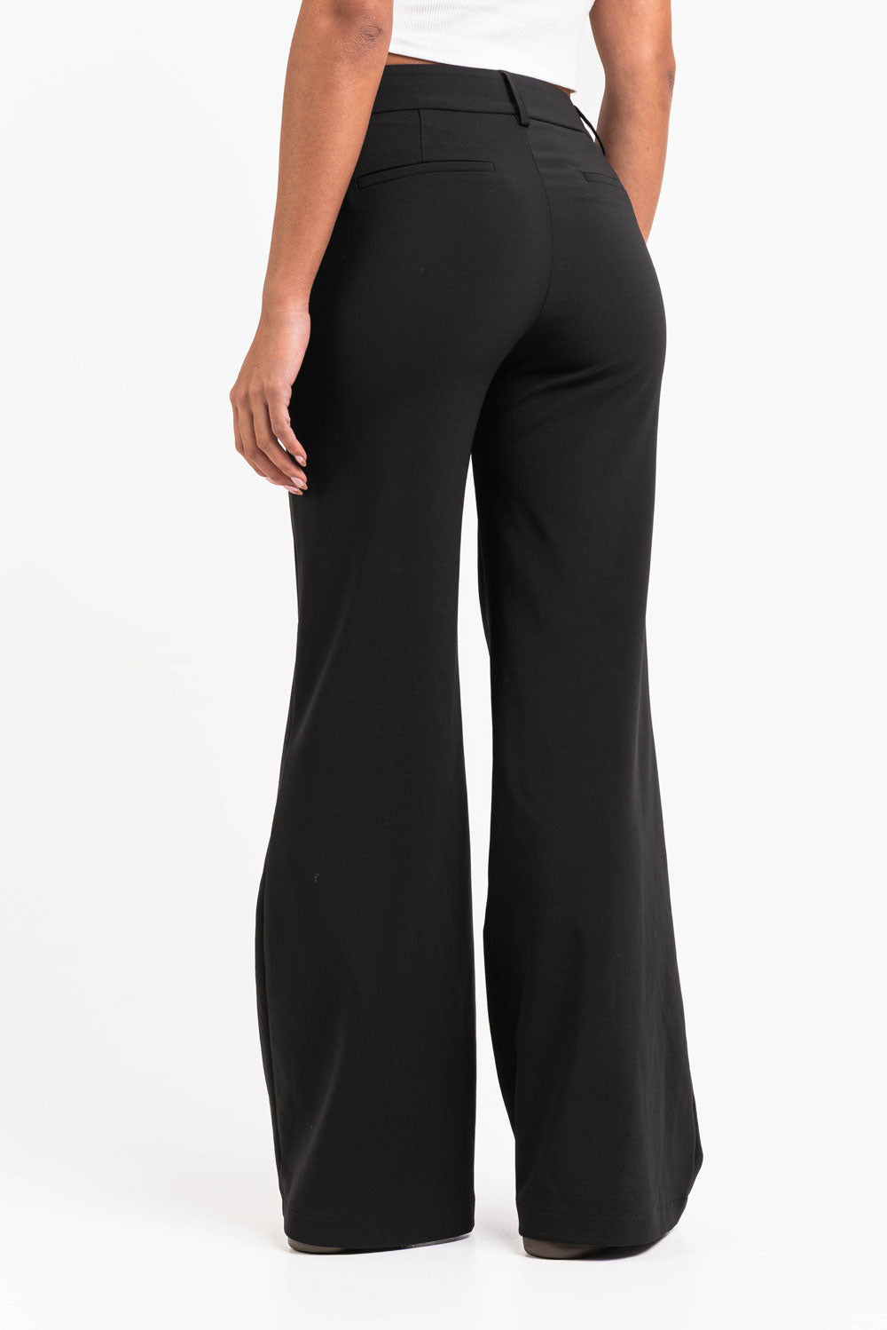 Suit pants with a mid waist and flared legs. Made from a stretch fabric that ensures a comfortable fit all day. Featuring faux back pockets and wide belt loops to hold both narrow and wide belts. The pants close with a zipper, hook, and hidden button.