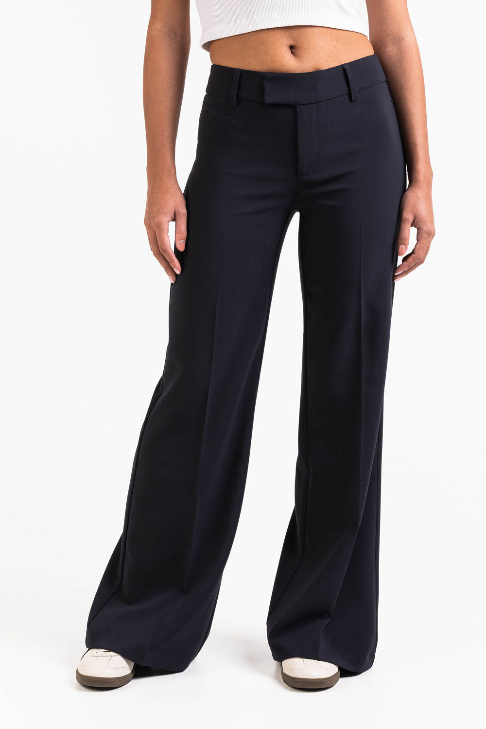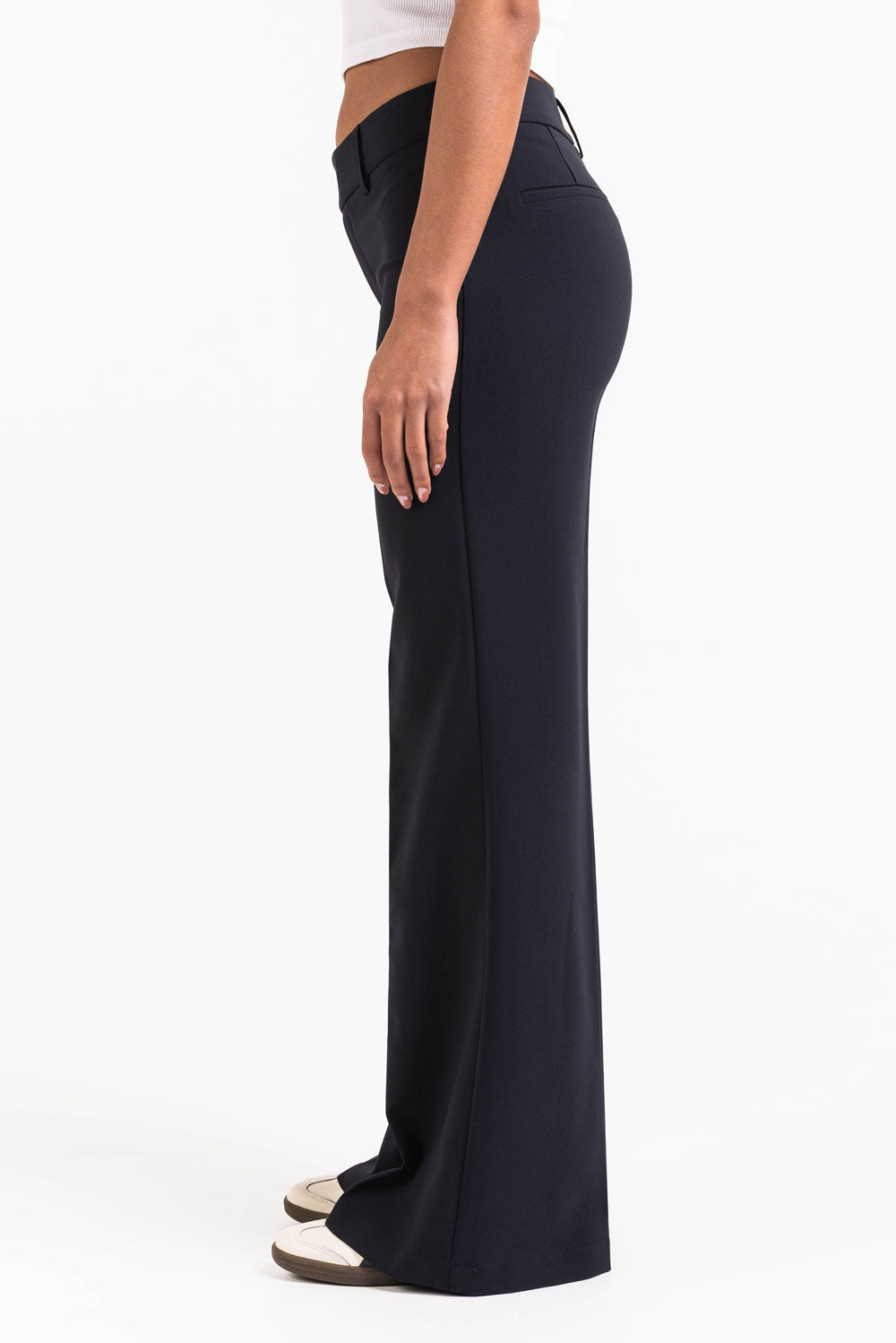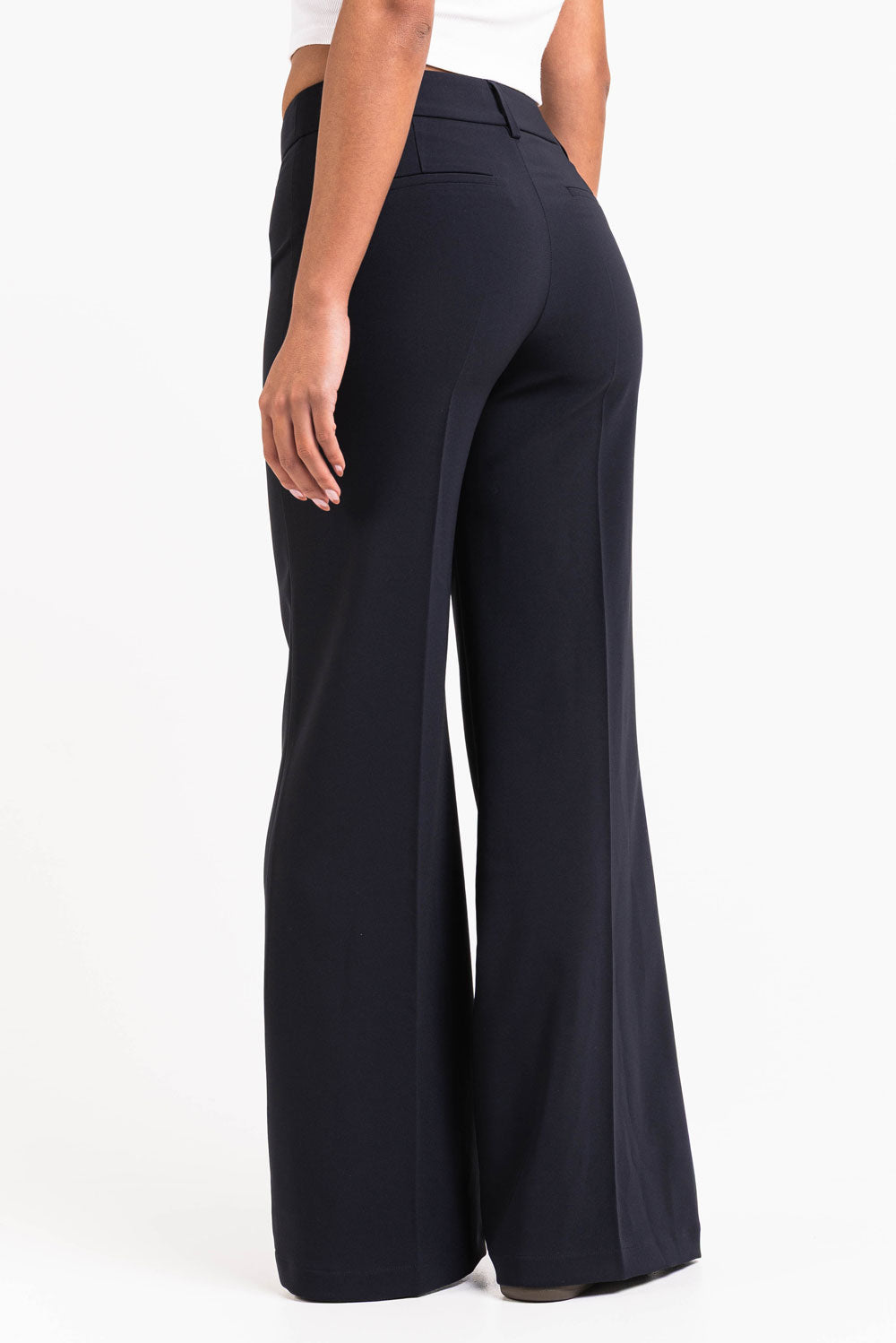 Anzughosen mit mittlerer Taille und ausgestellten Beinen. Hergestellt aus einem dehnbaren Stoff, der den ganzen Tag über einen bequemen Sitz garantiert. Mit aufgesetzten Gesäßtaschen und breiten Gürtelschlaufen, die sowohl schmale als auch breite Gürtel halten. Die Hose wird mit Reißverschluss, Haken und verdecktem Knopf geschlossen.