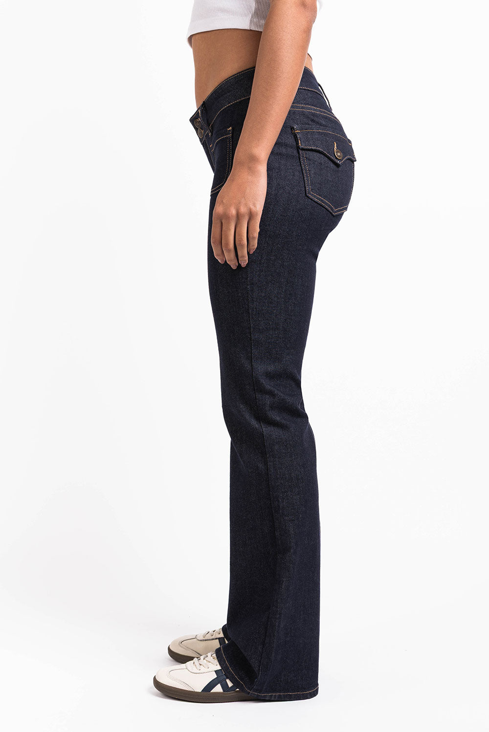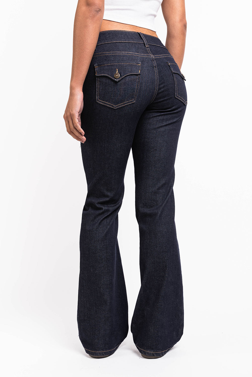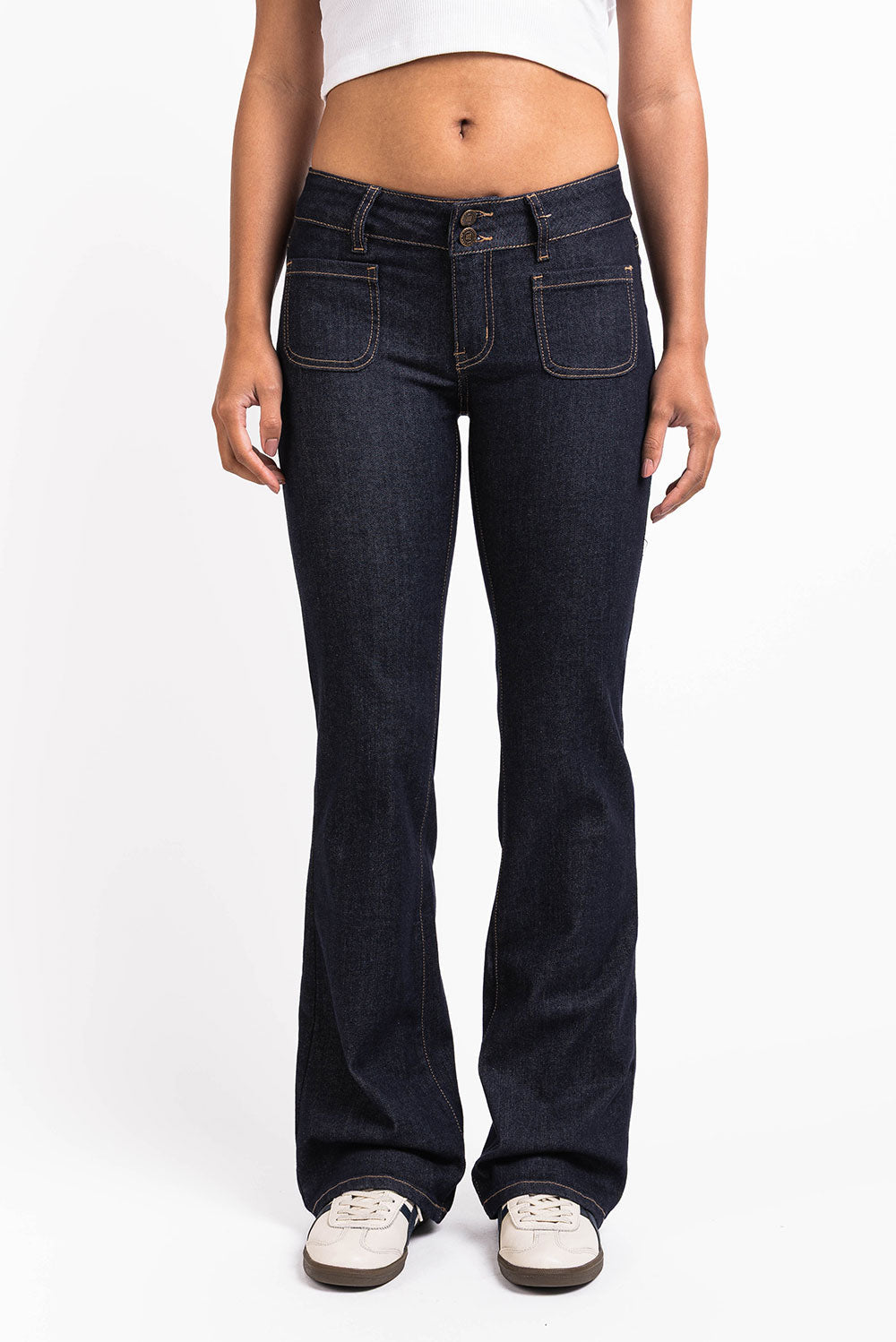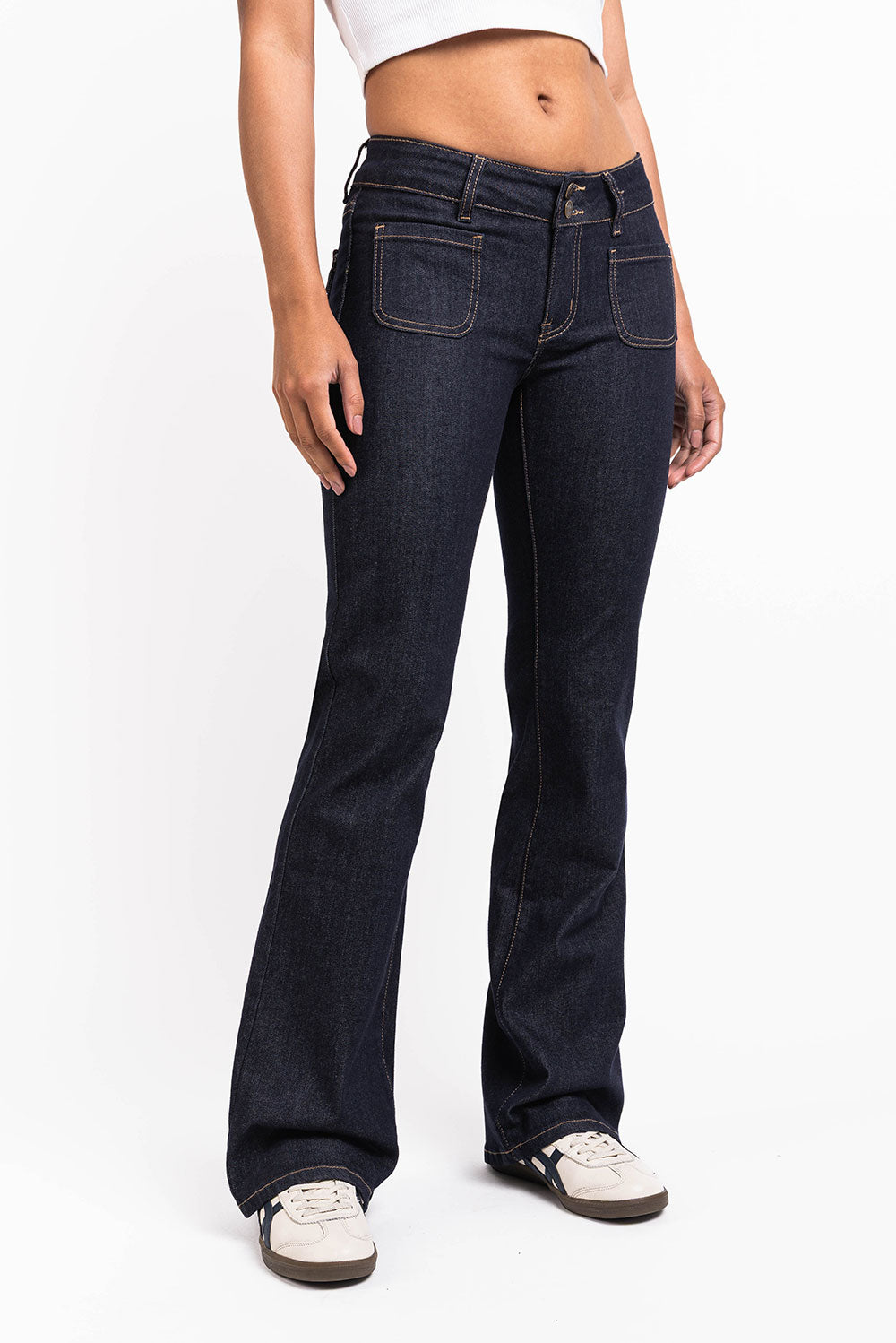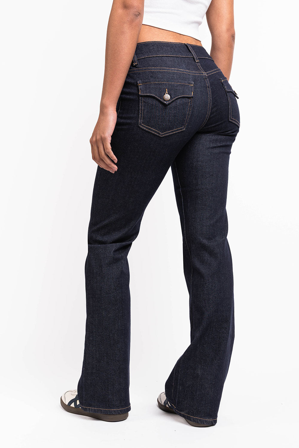 Jeans mit tiefer Taille und ausgestelltem Hosenbein und vorderen Taschen sowie hinteren Taschen mit Klappe und Knopf. Großzügige Gürtelschlaufen welche sowohl einem schmalen als auch breiteren Gürtel Platz bieten. Die Hose schließt mittels doppelter Knopfreihe und Reißverschluss.