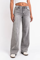 Mid waist-Jeans mit weitem Bein und Taschen vorne und hinten. Gürtelschlaufen, die sowohl für schmalere als auch breitere Gürtel geeignet sind. Die Hose wird mit Reißverschluss und Knopf geschlossen.