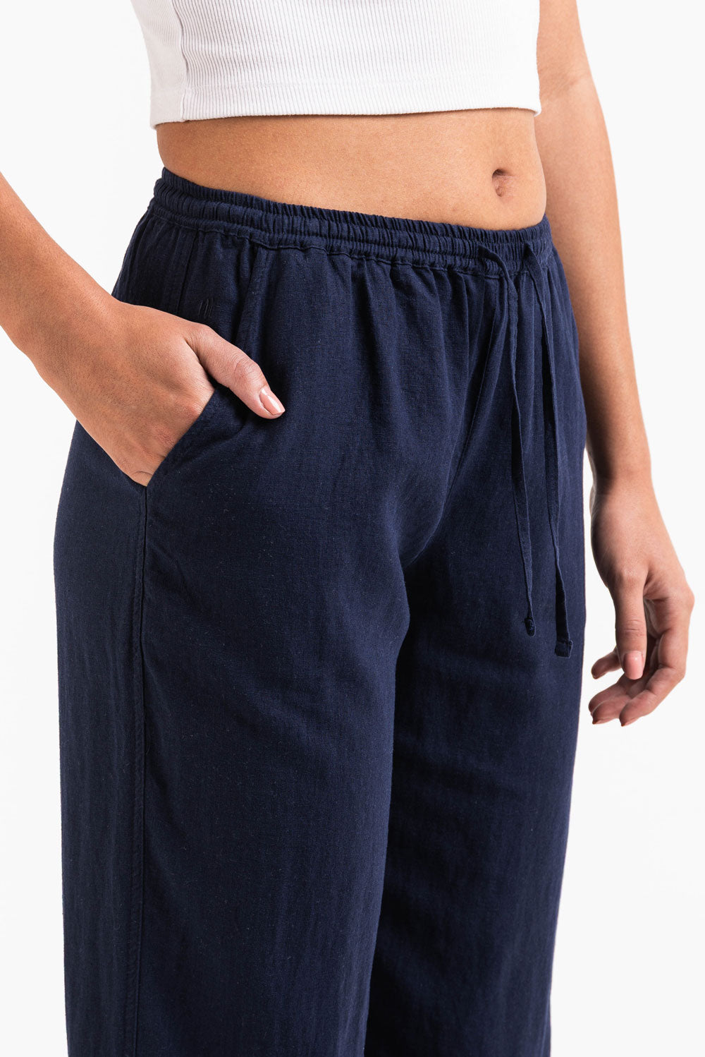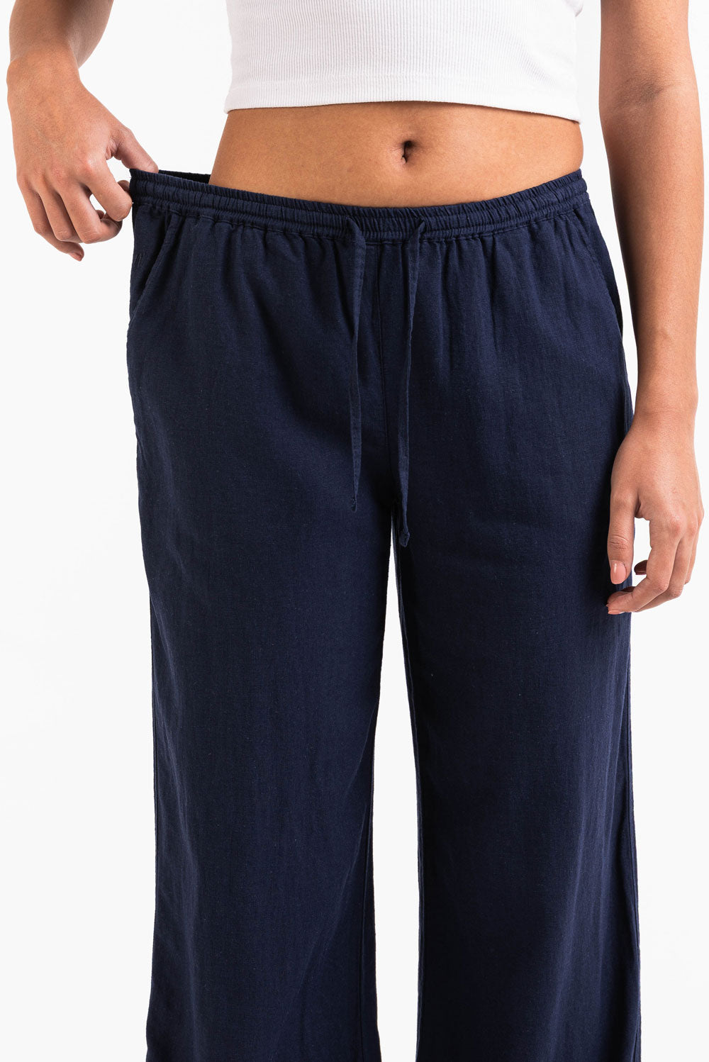 Diese mittel taillierte Leinenhose hat eine entspannte gerade Passform mit praktischen Seitentaschen. Der elastische Bund Kordelzug und das faltbare Design sorgen für eine sichere Passform während sie leicht und atmungsaktiv bleibt.